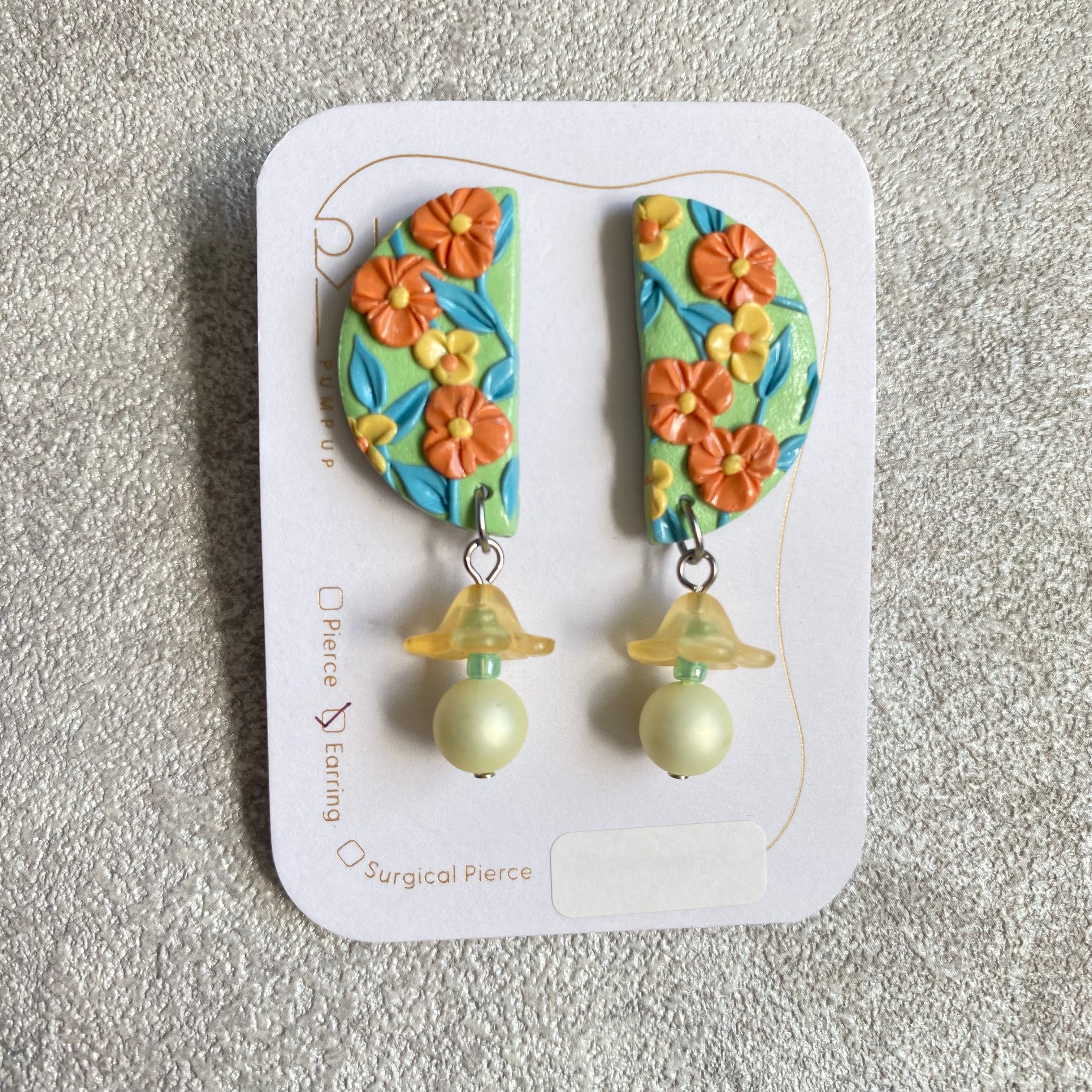 BAKE半円×ビーズ イヤリング(黄緑オレンジ
