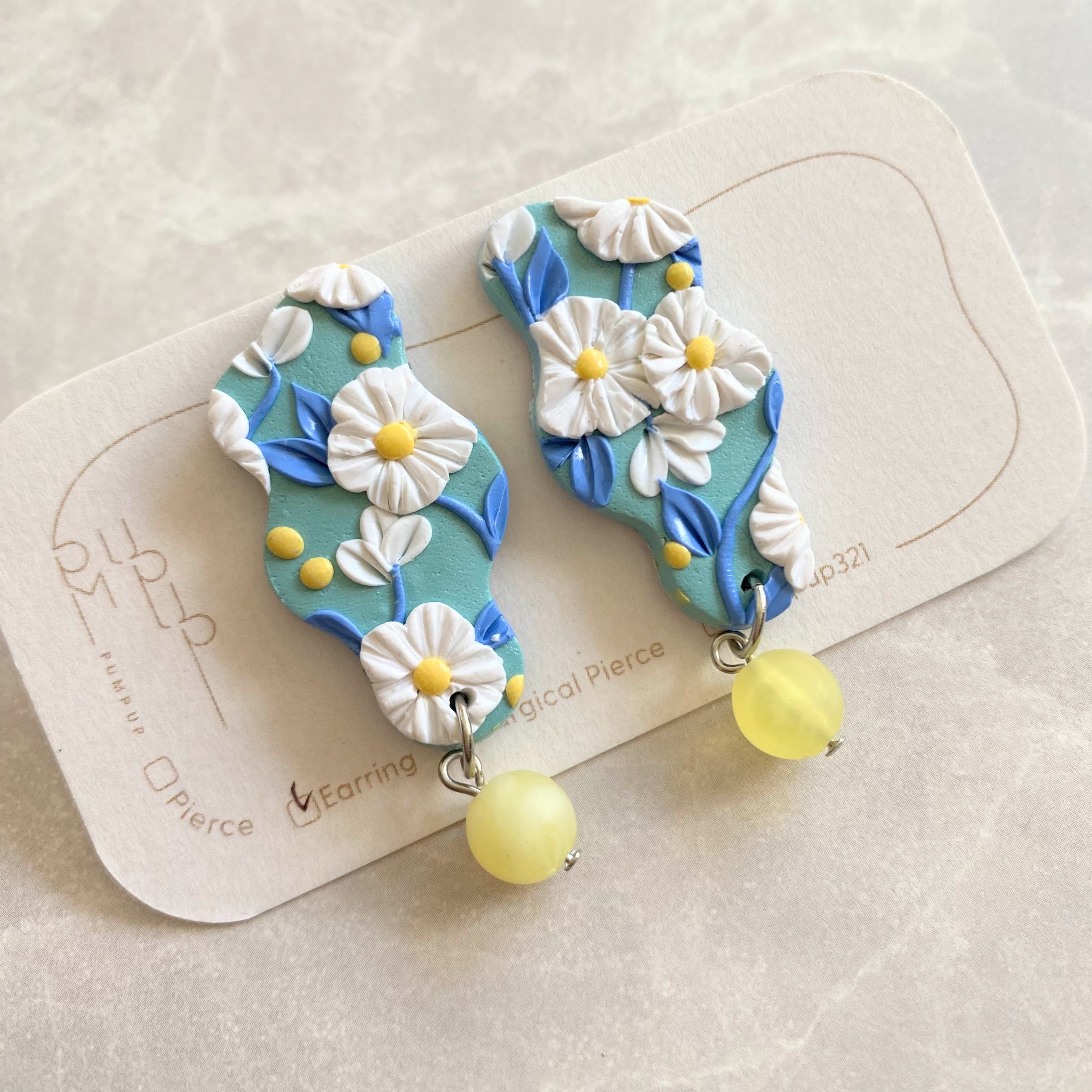 BAKEくねくね×ビーズ イヤリング(水色・白・黄色