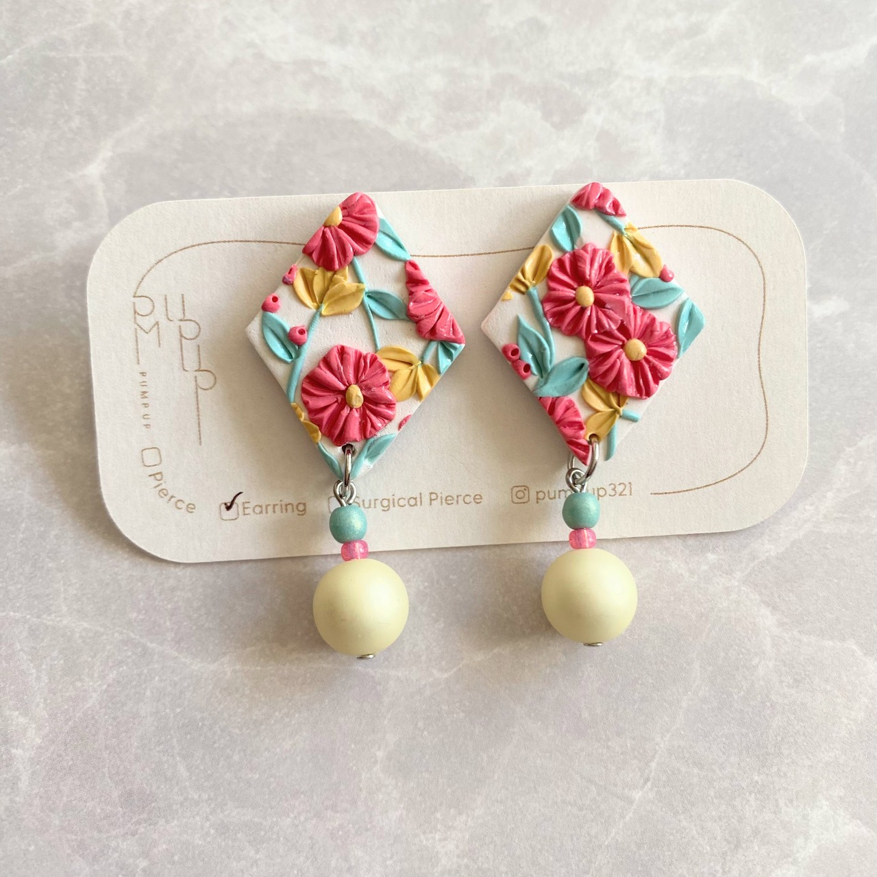 BAKE菱形×ビーズ イヤリング(白・ミント・赤・黄色