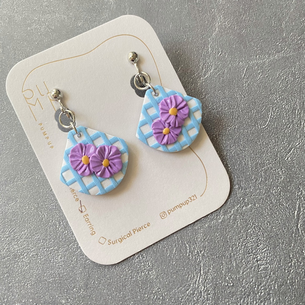 BAKE扇型 ピアス/イヤリング(白・水色・紫 ワッフルチェック