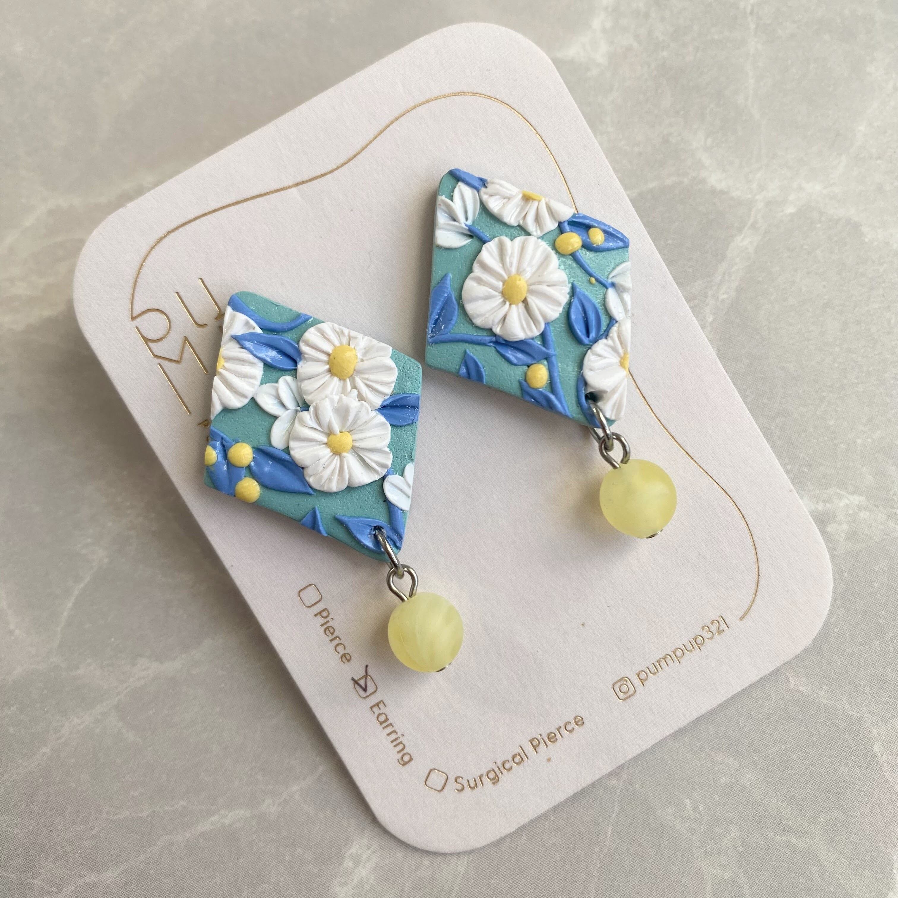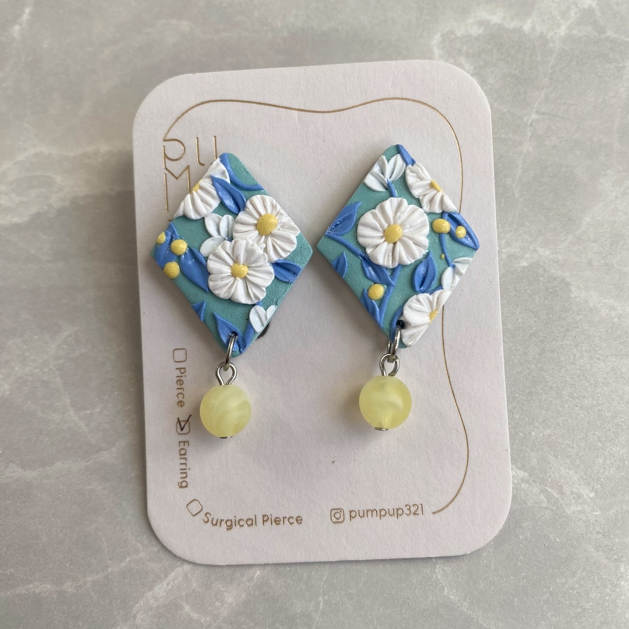 BAKE菱形×ビーズ イヤリング(水色・ブルー・白・黄色