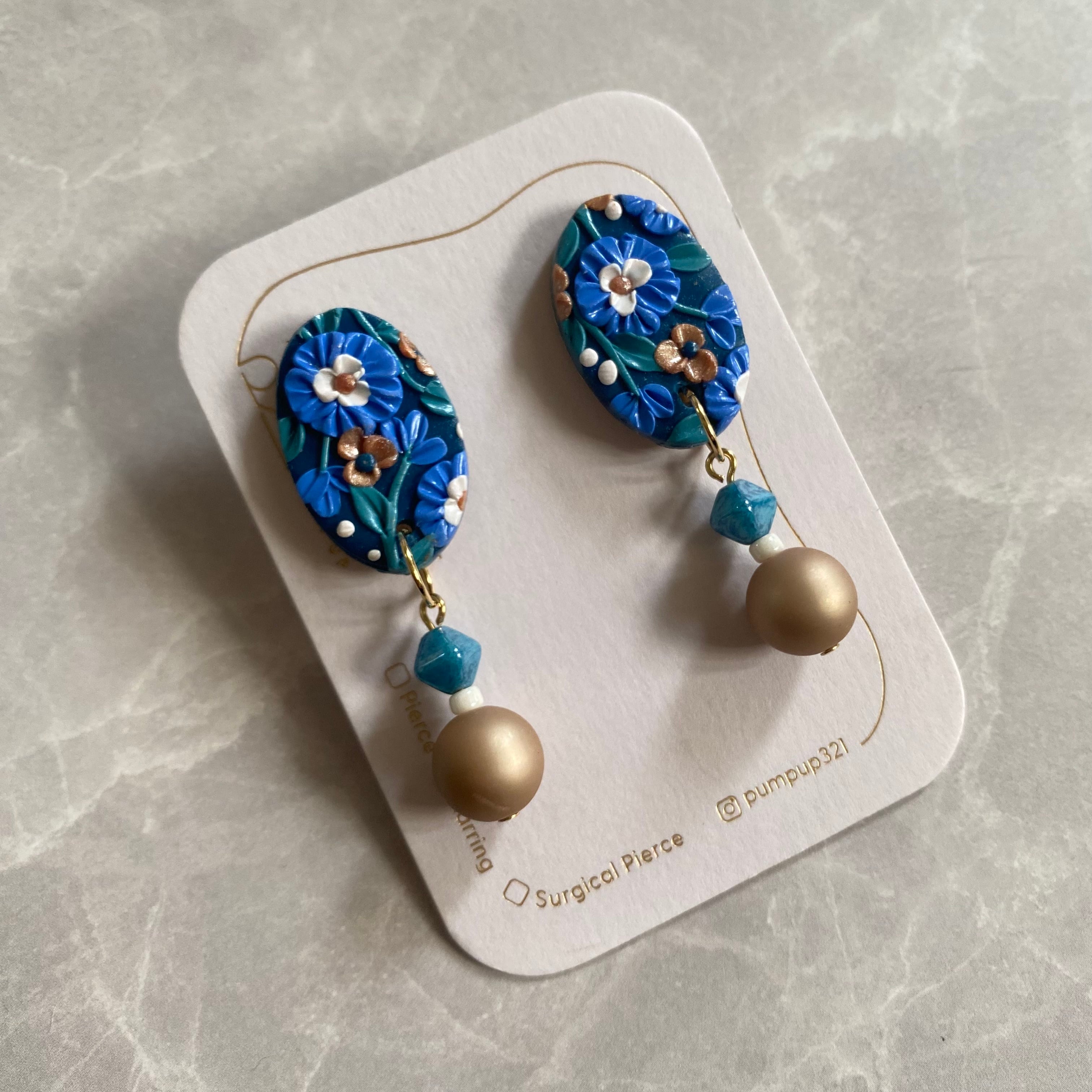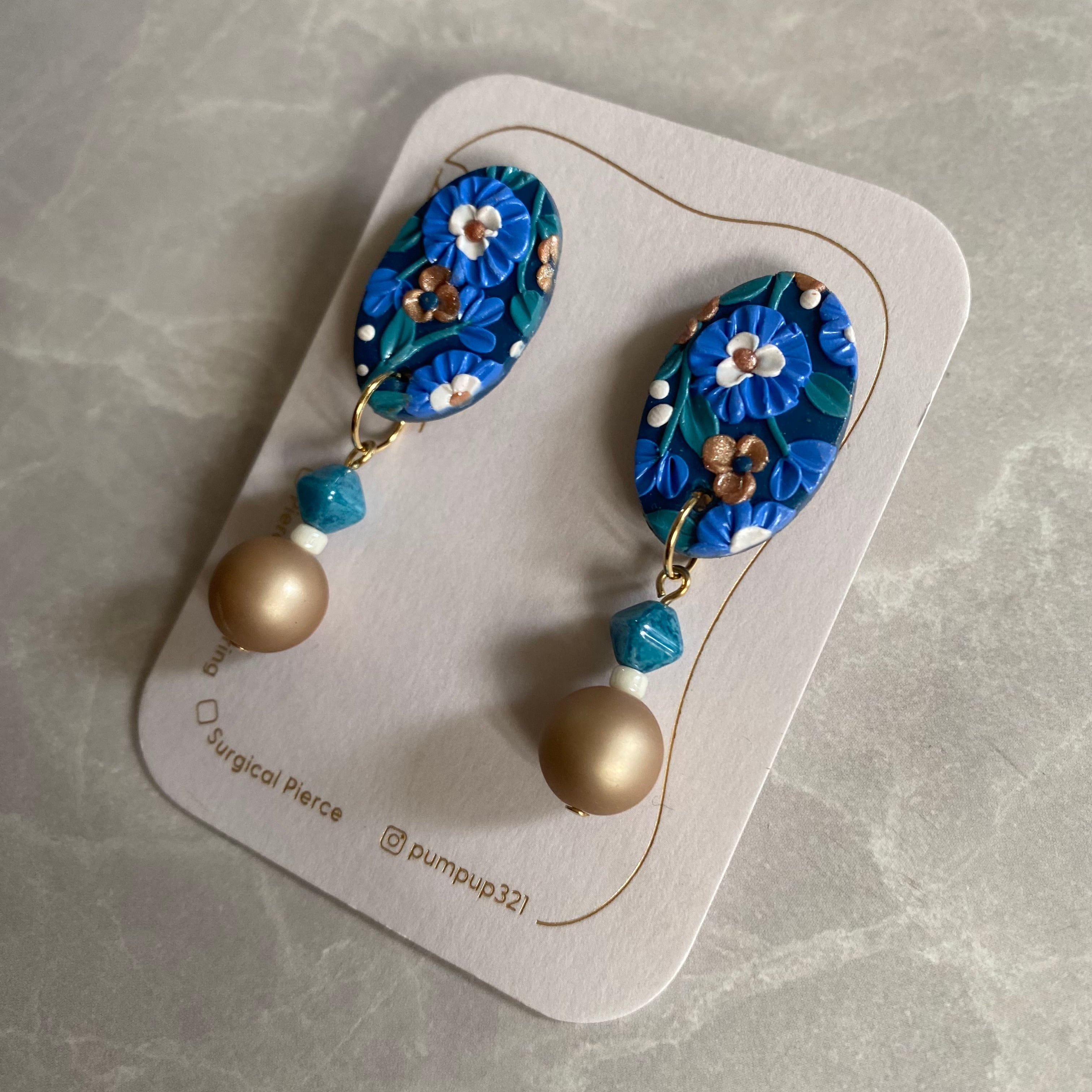 BAKEソフト楕円×ビーズ イヤリング(ネイビー・ブルー・白・ゴールド