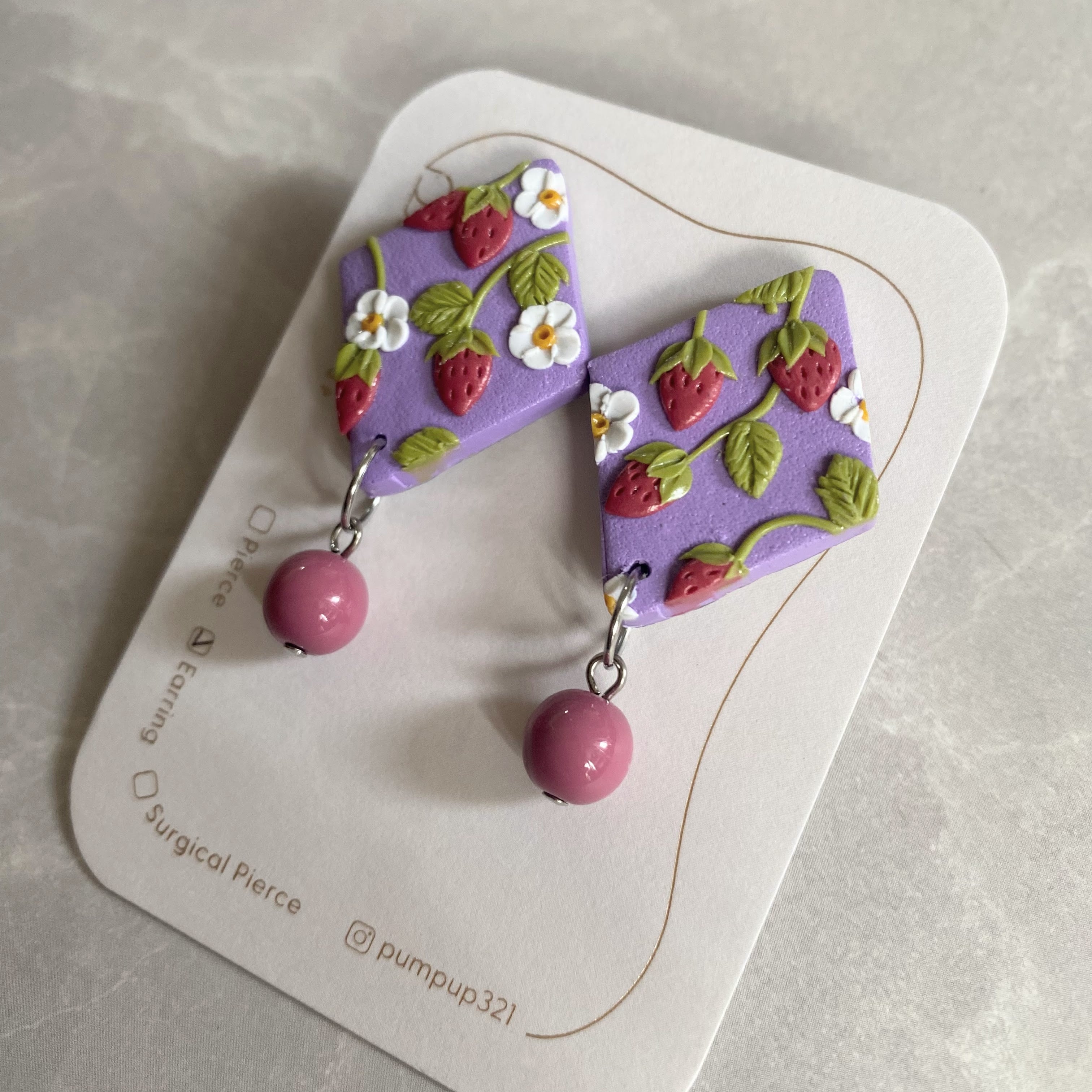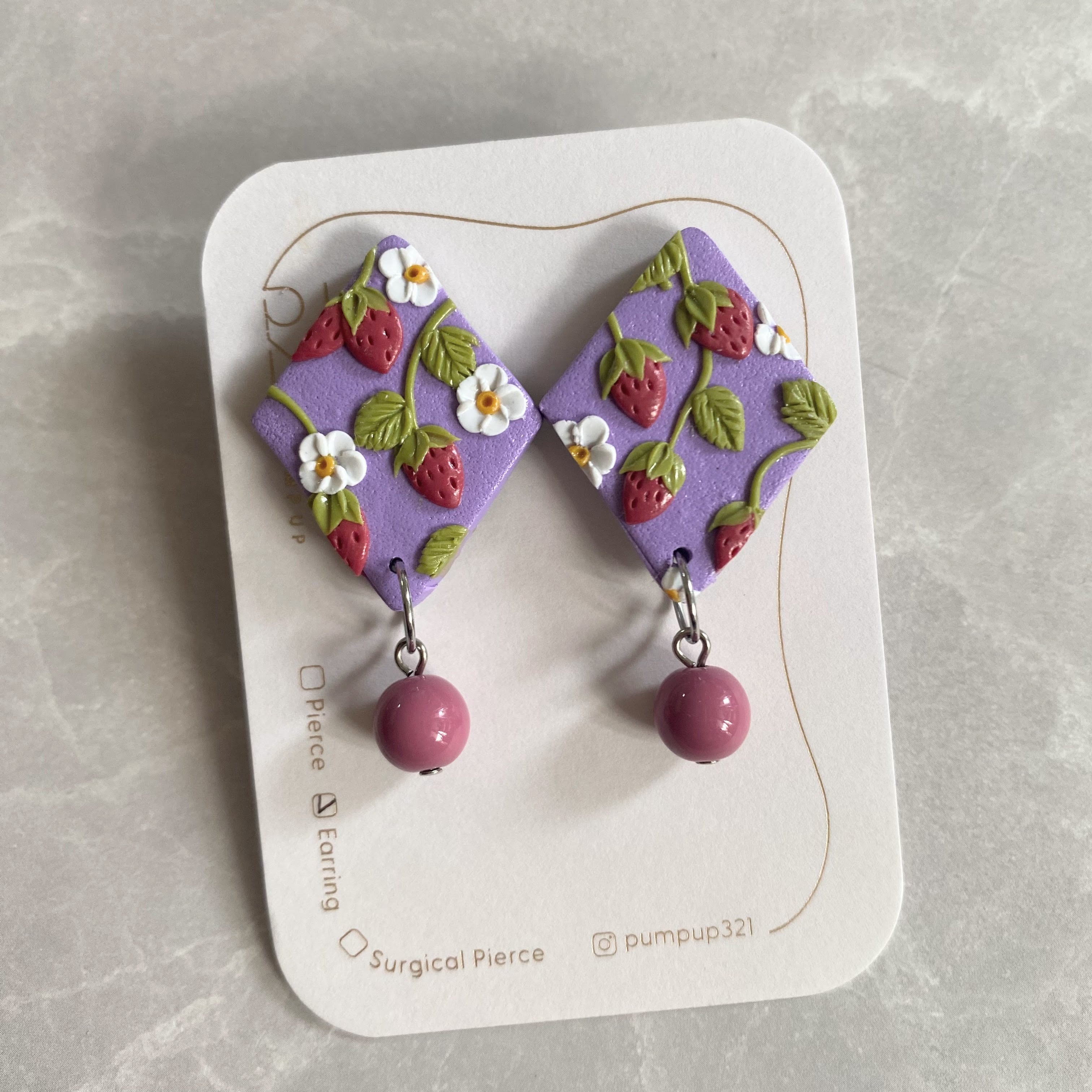 BAKE菱形×ビーズ イヤリング(いちご 紫