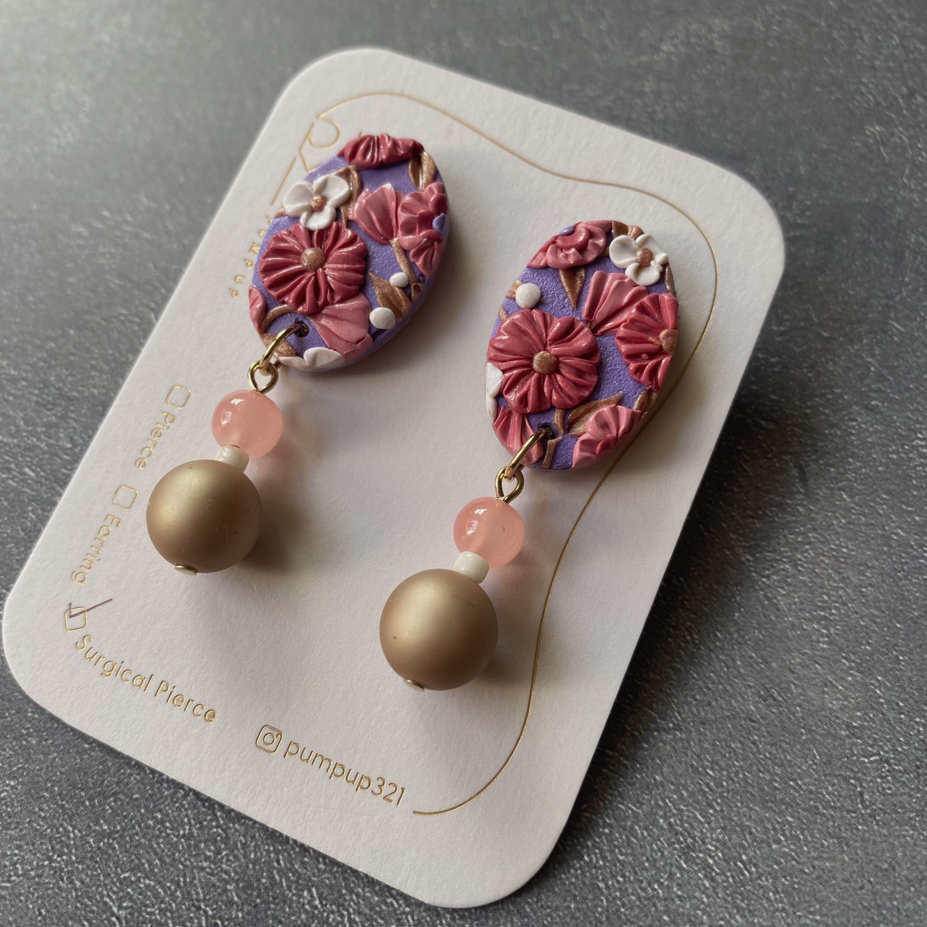 BAKEソフト楕円×ビーズ サージカルピアス(紫・ゴールド・ピンク・白