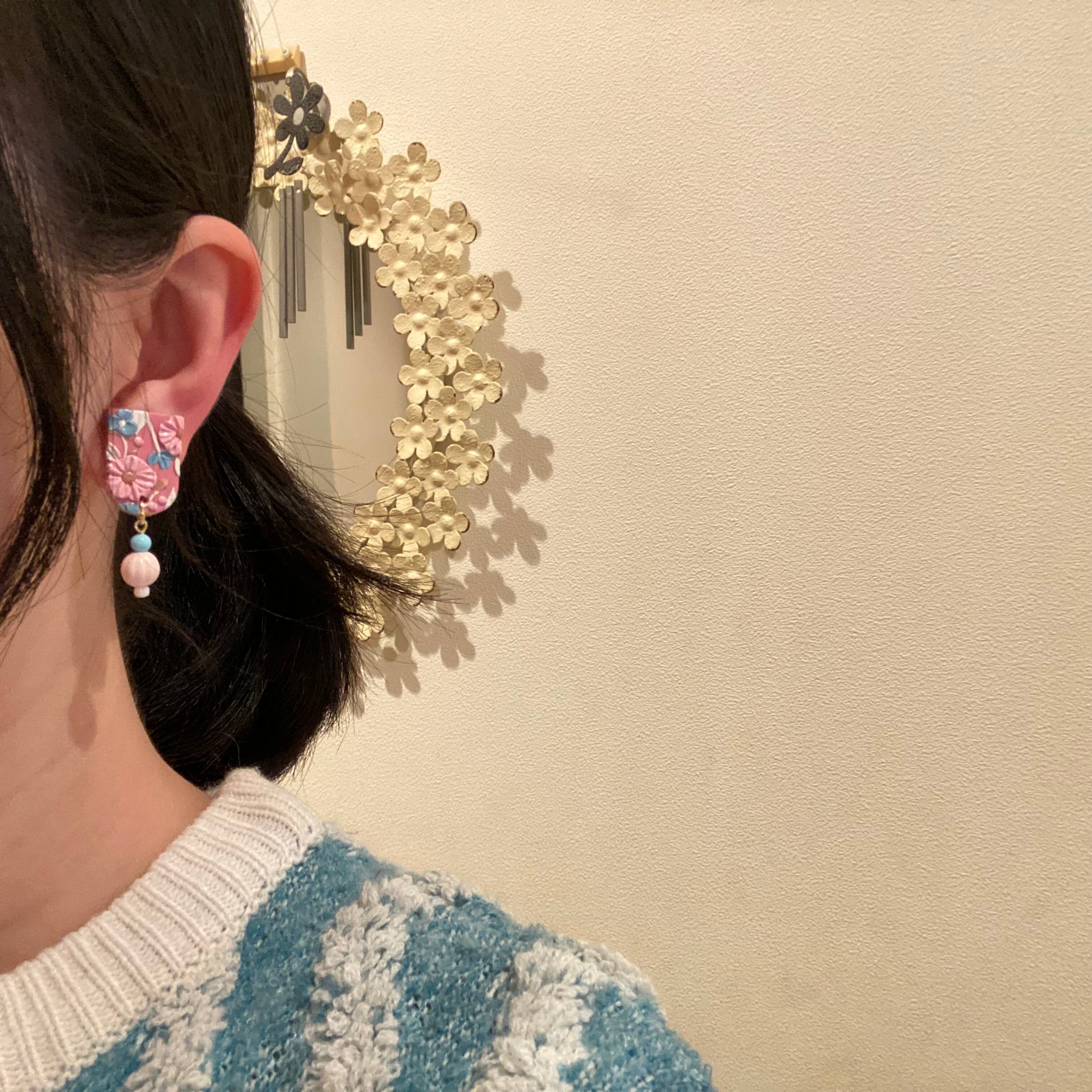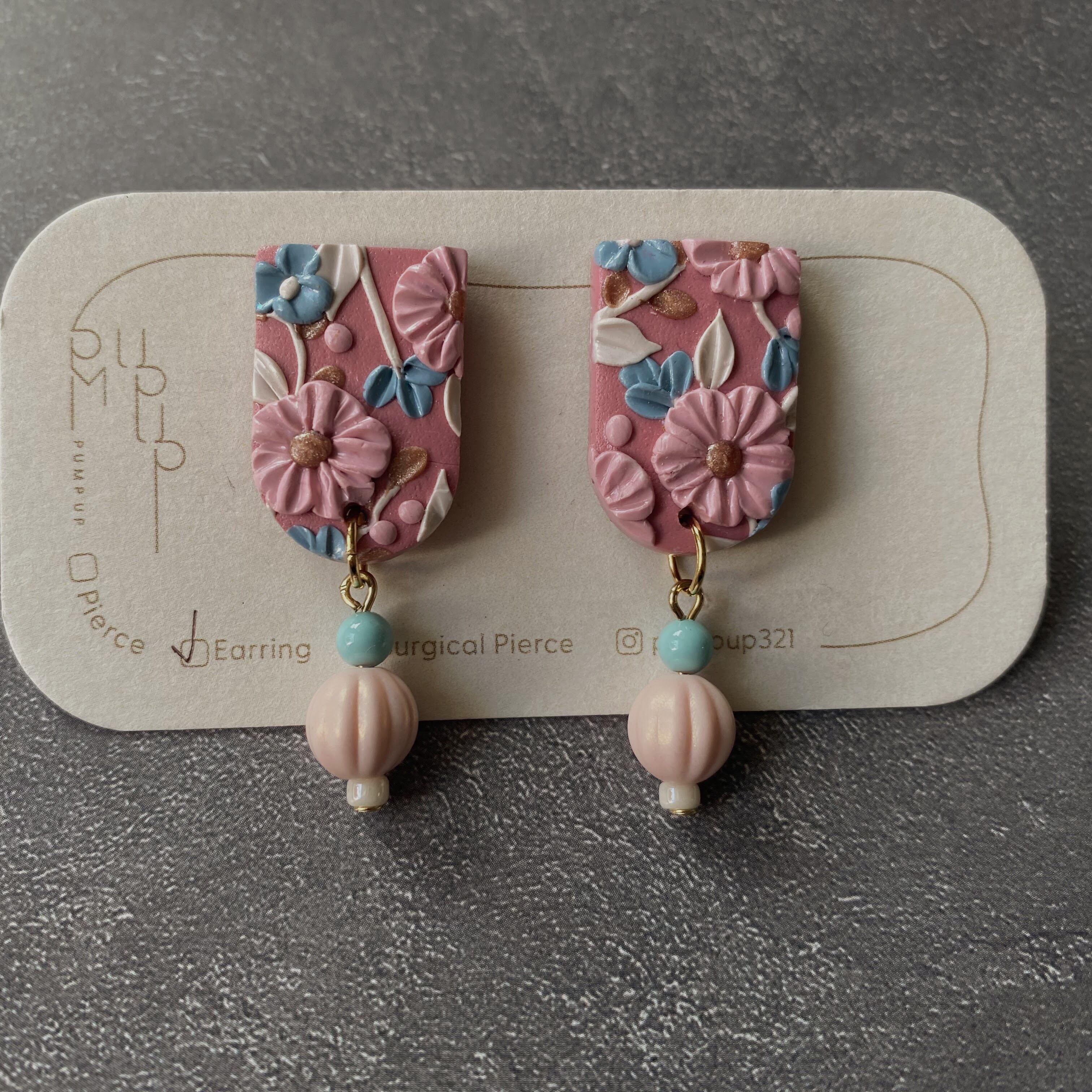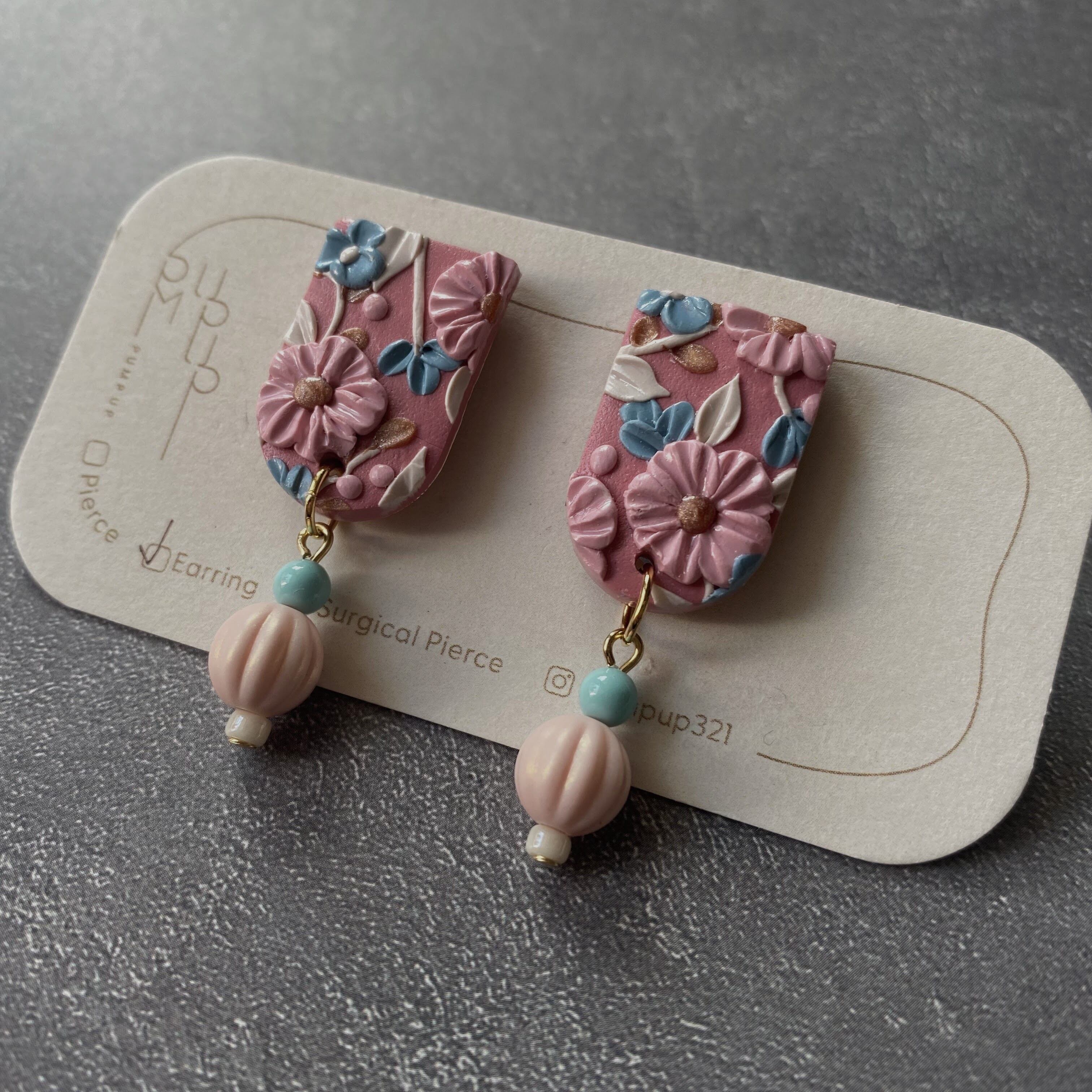 BAKE半楕円×ビーズ イヤリング(ピンク・白・水色・金
