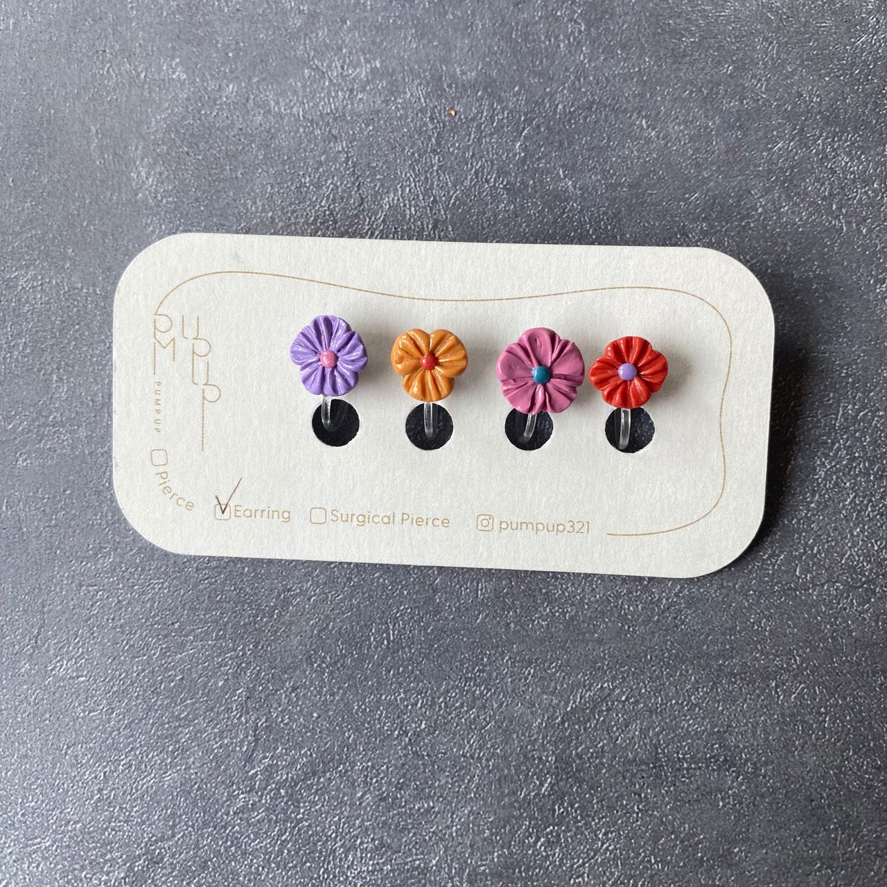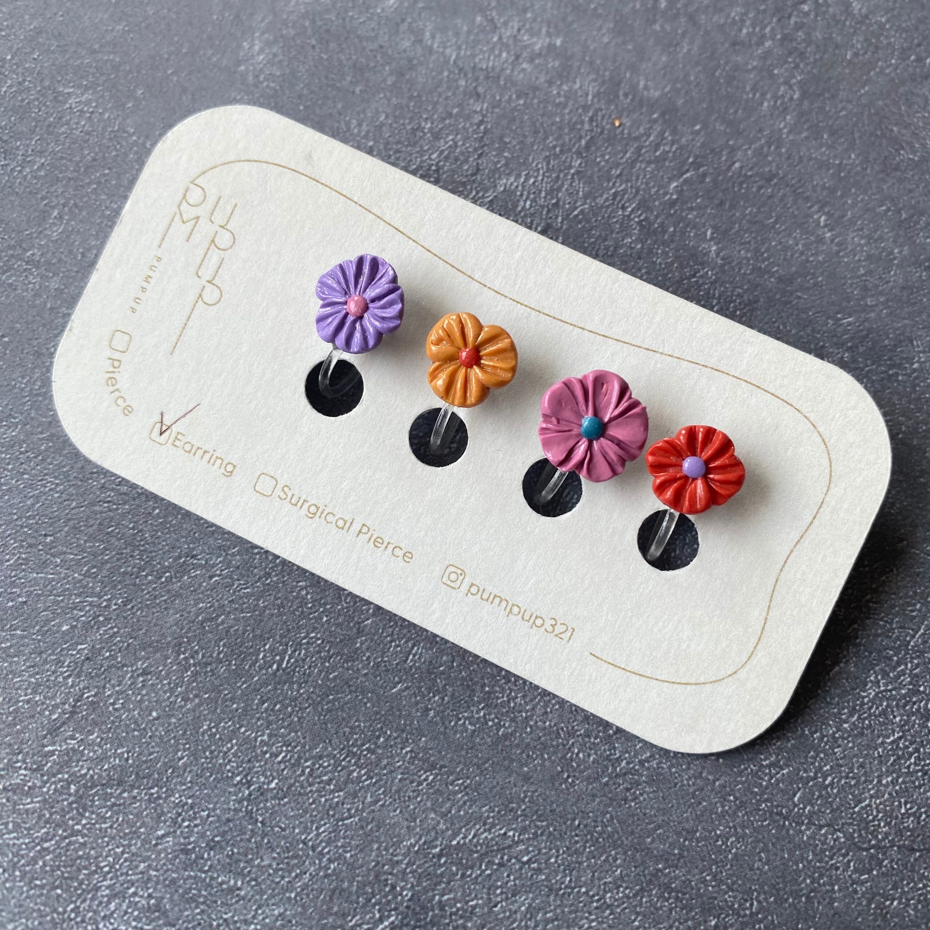 BAKEミニフラワー4種セット 樹脂イヤリング(紫・黄色・ピンク・オレンジ