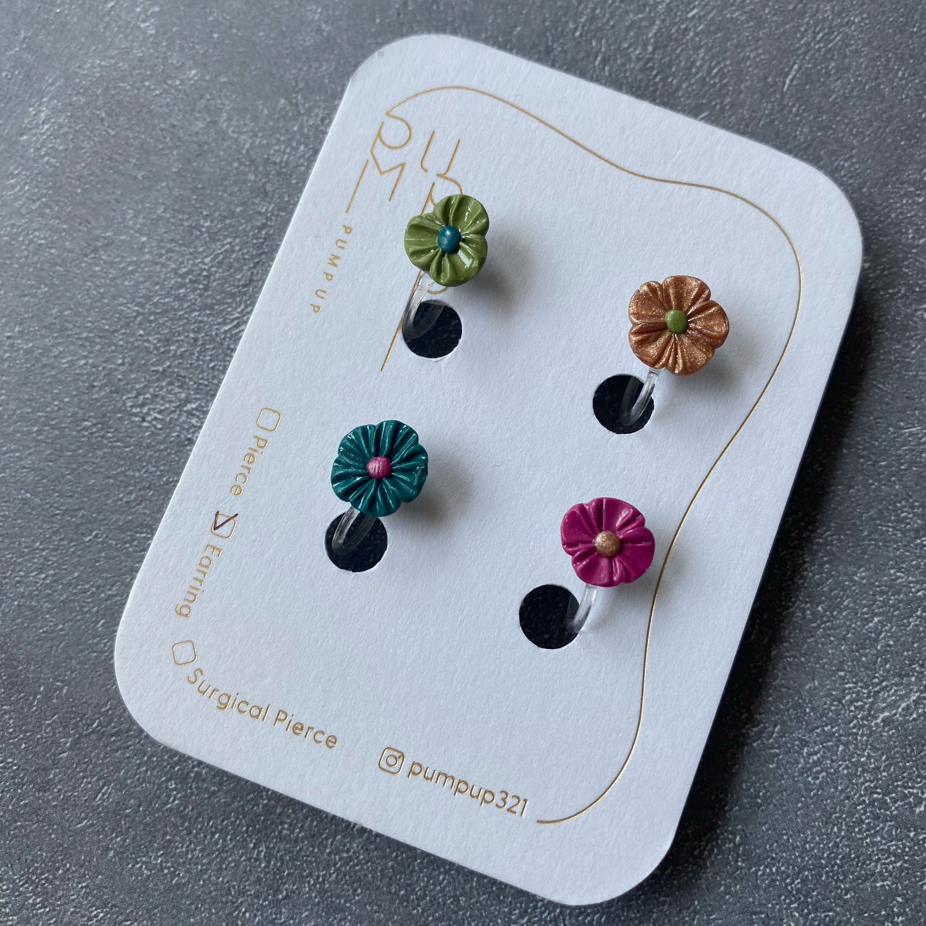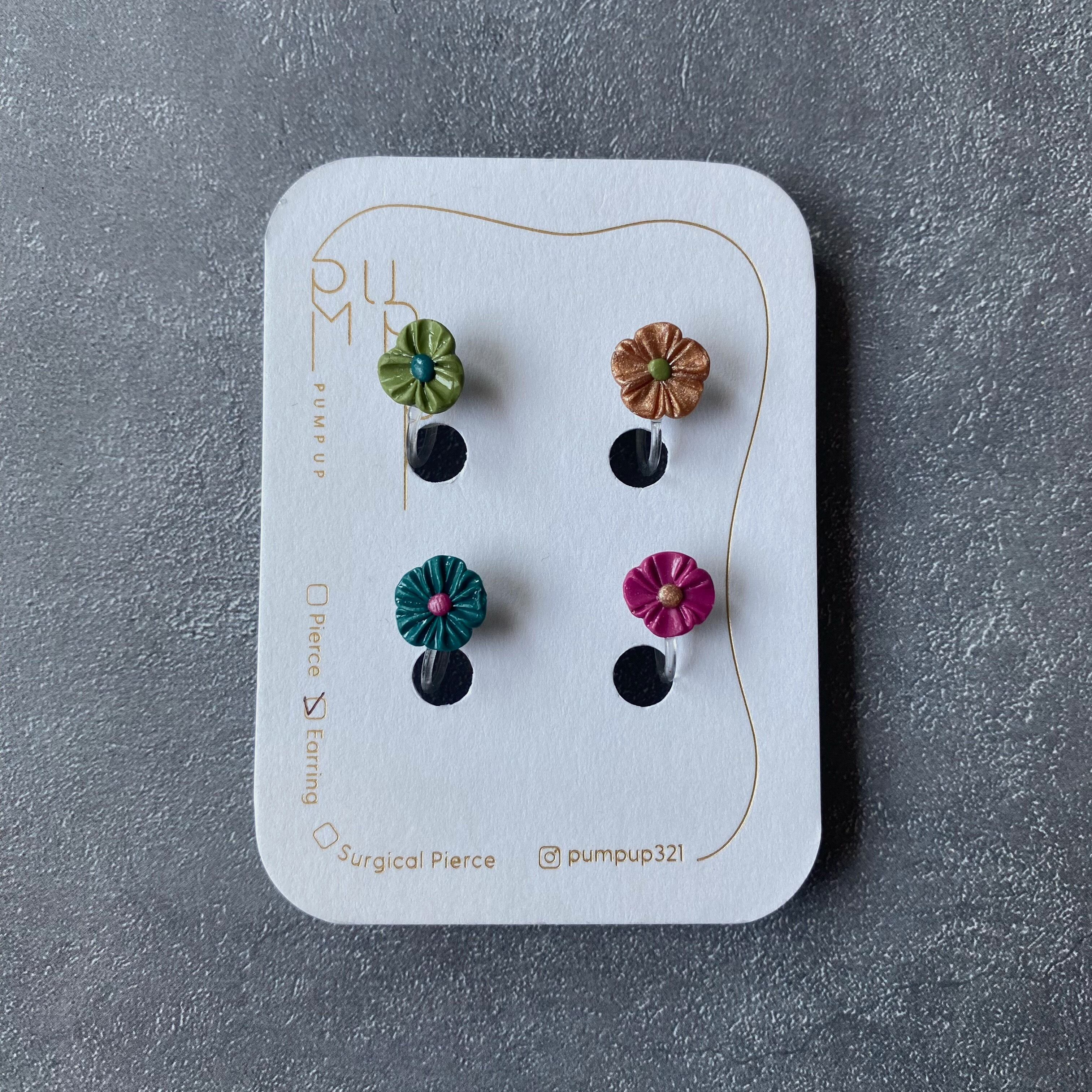 BAKEミニフラワー4種セット 樹脂イヤリング(緑・金・カシス・深緑