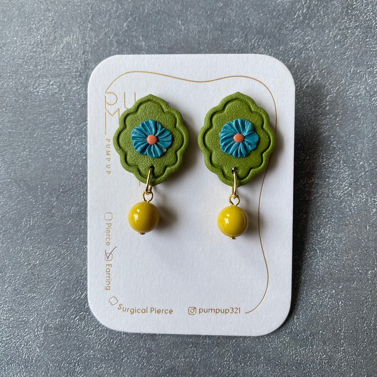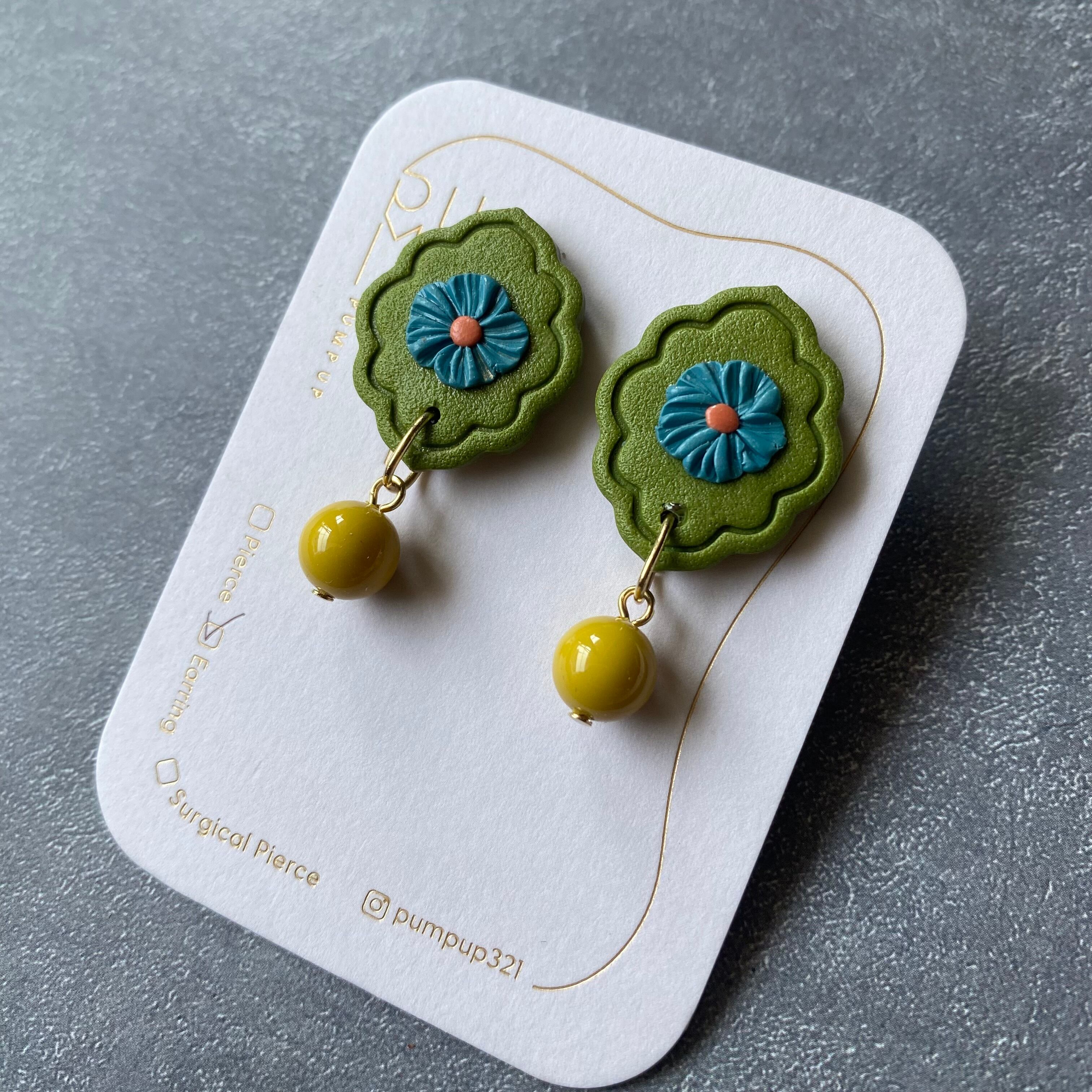 BAKEくねくね菱形×ビーズ イヤリング(緑・ブルー