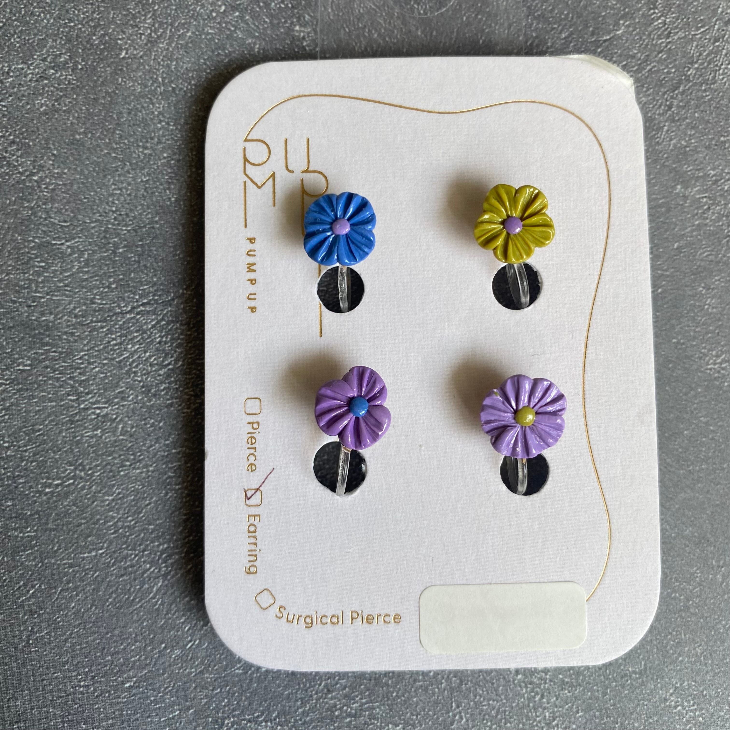 BAKEミニフラワー4種セット 樹脂イヤリング(紫・緑・青
