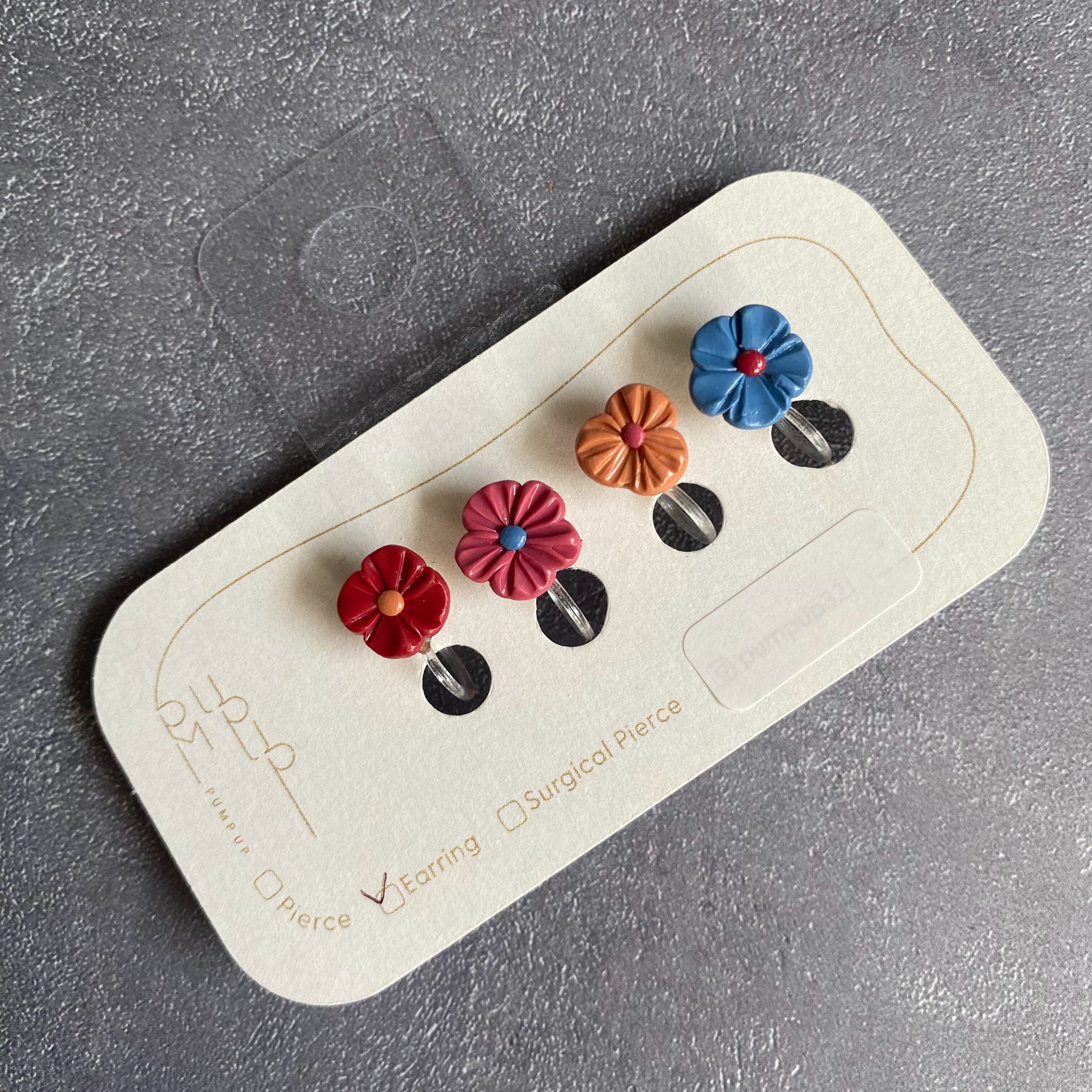 BAKEミニフラワー4種セット 樹脂イヤリング(赤・オレンジ・ピンク・ブルー