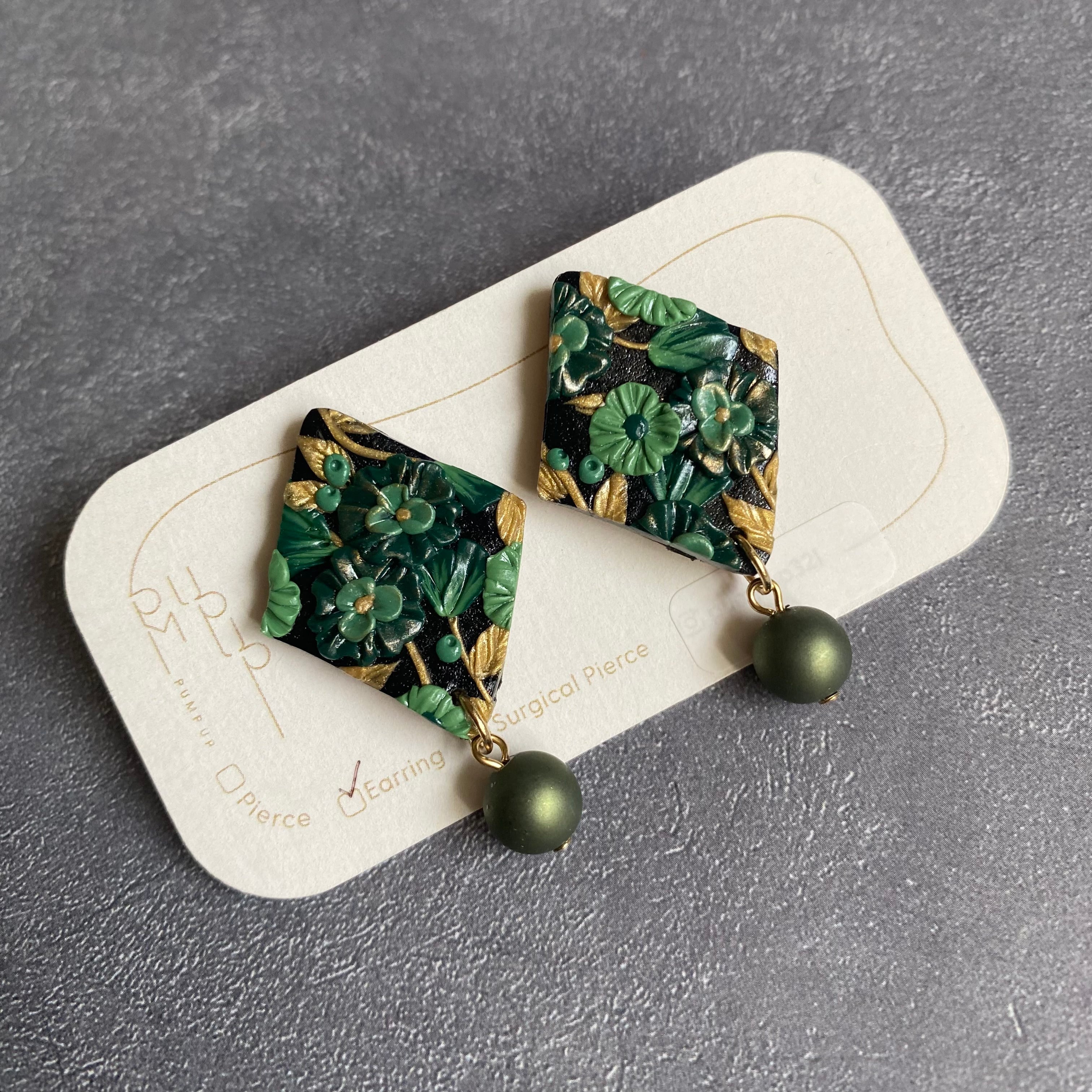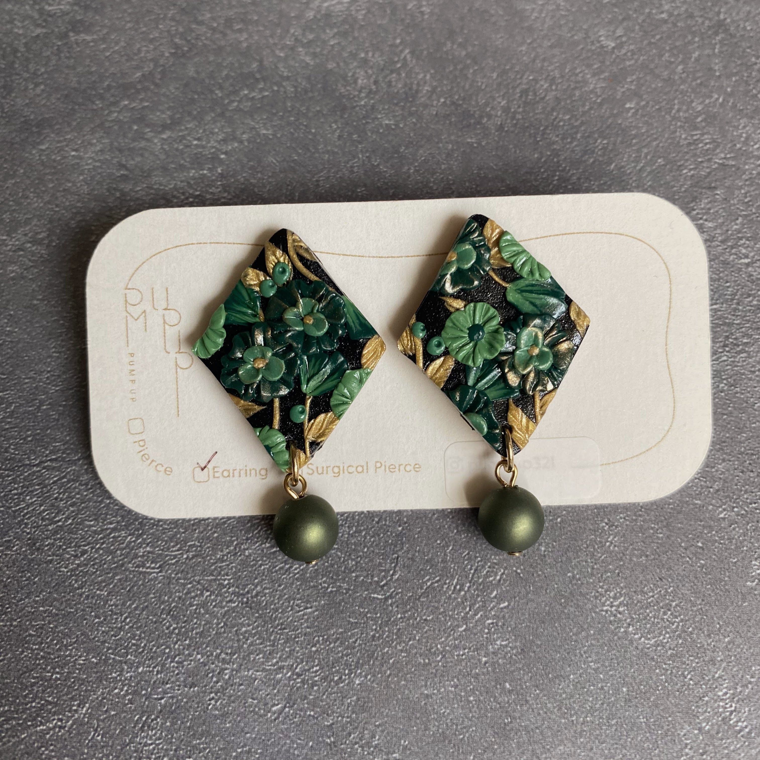 BAKE菱形×ビーズ イヤリング(黒・ゴールド・緑
