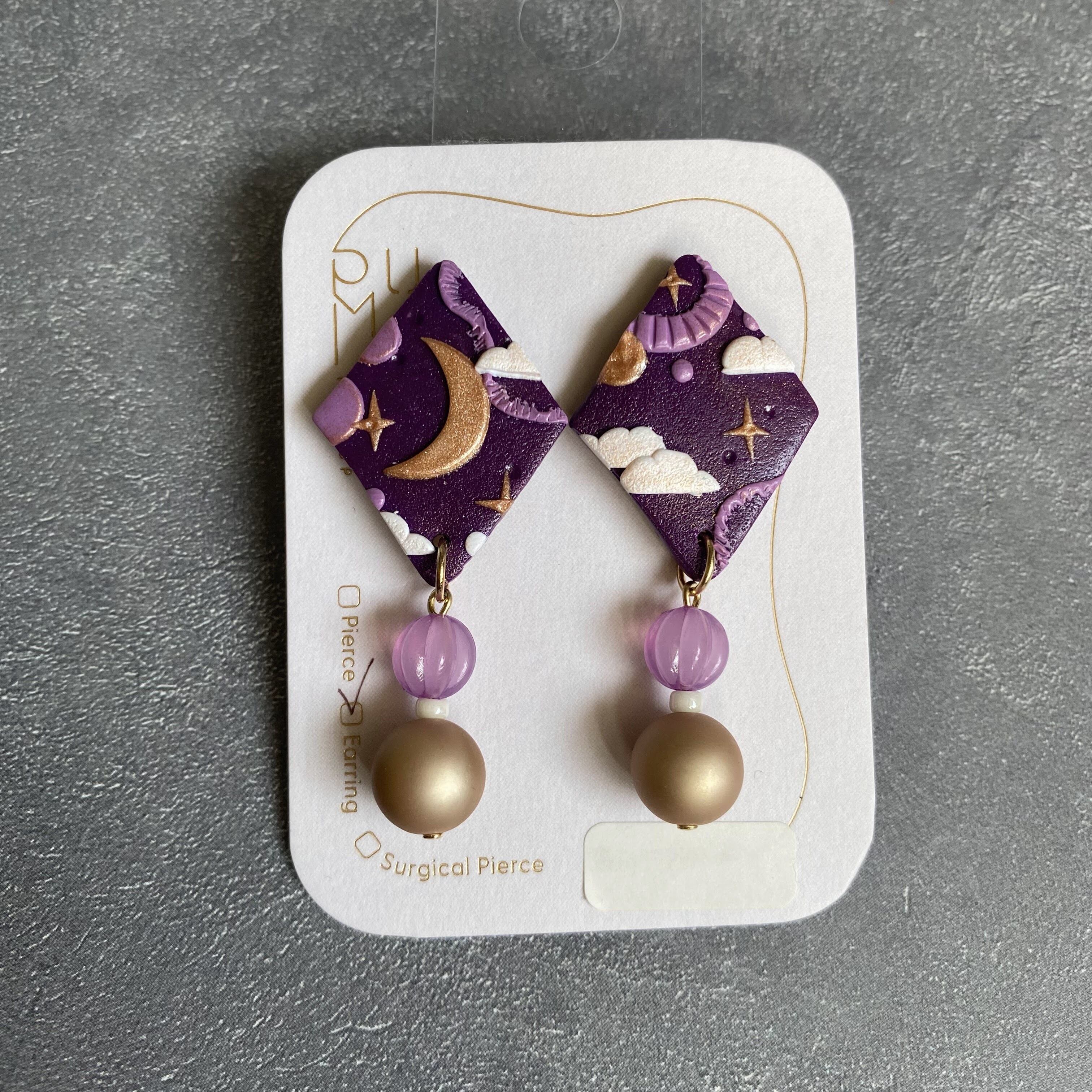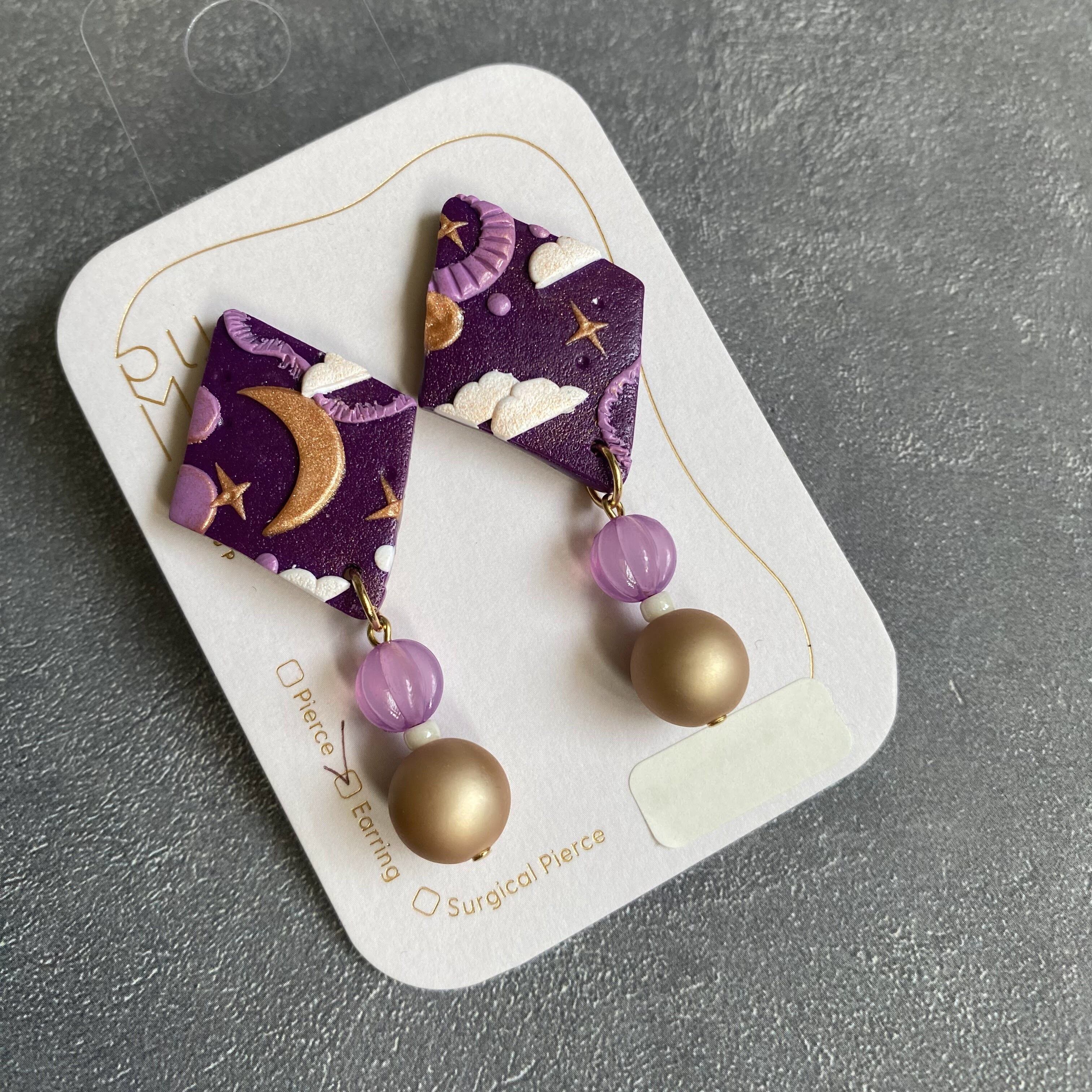BAKE菱形×ビーズ イヤリング(宇宙・紫・ゴールド・白
