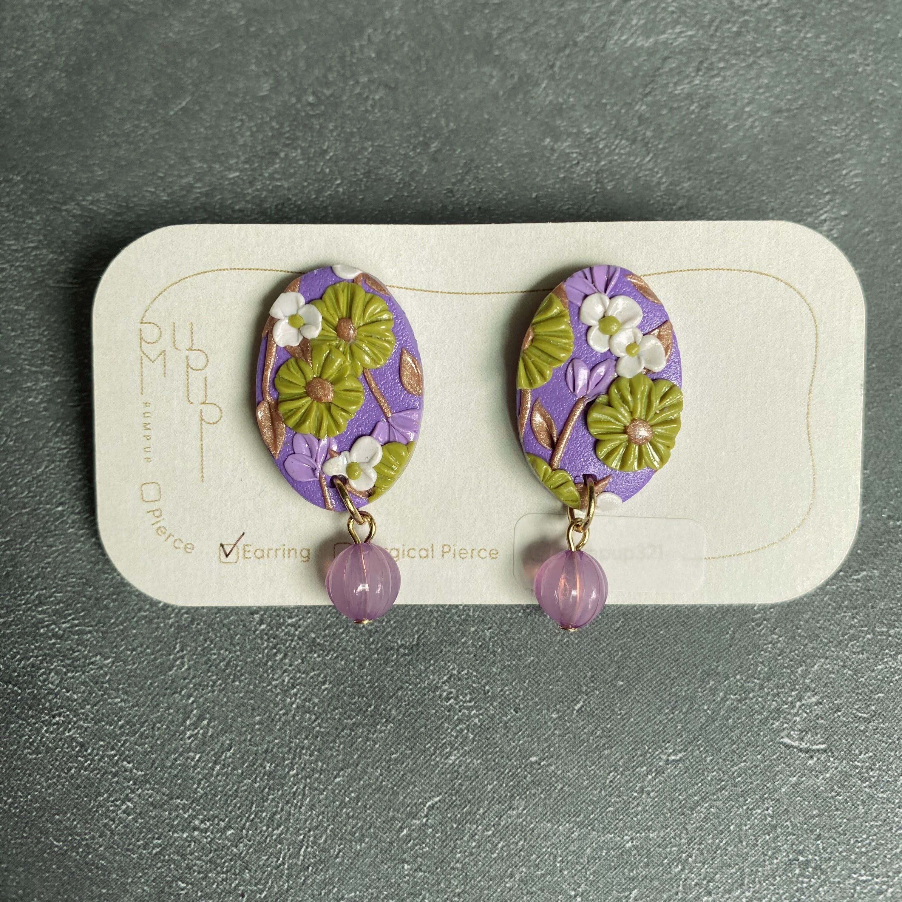 BAKEソフト楕円×ビーズ イヤリング(紫・ゴールド・緑・白