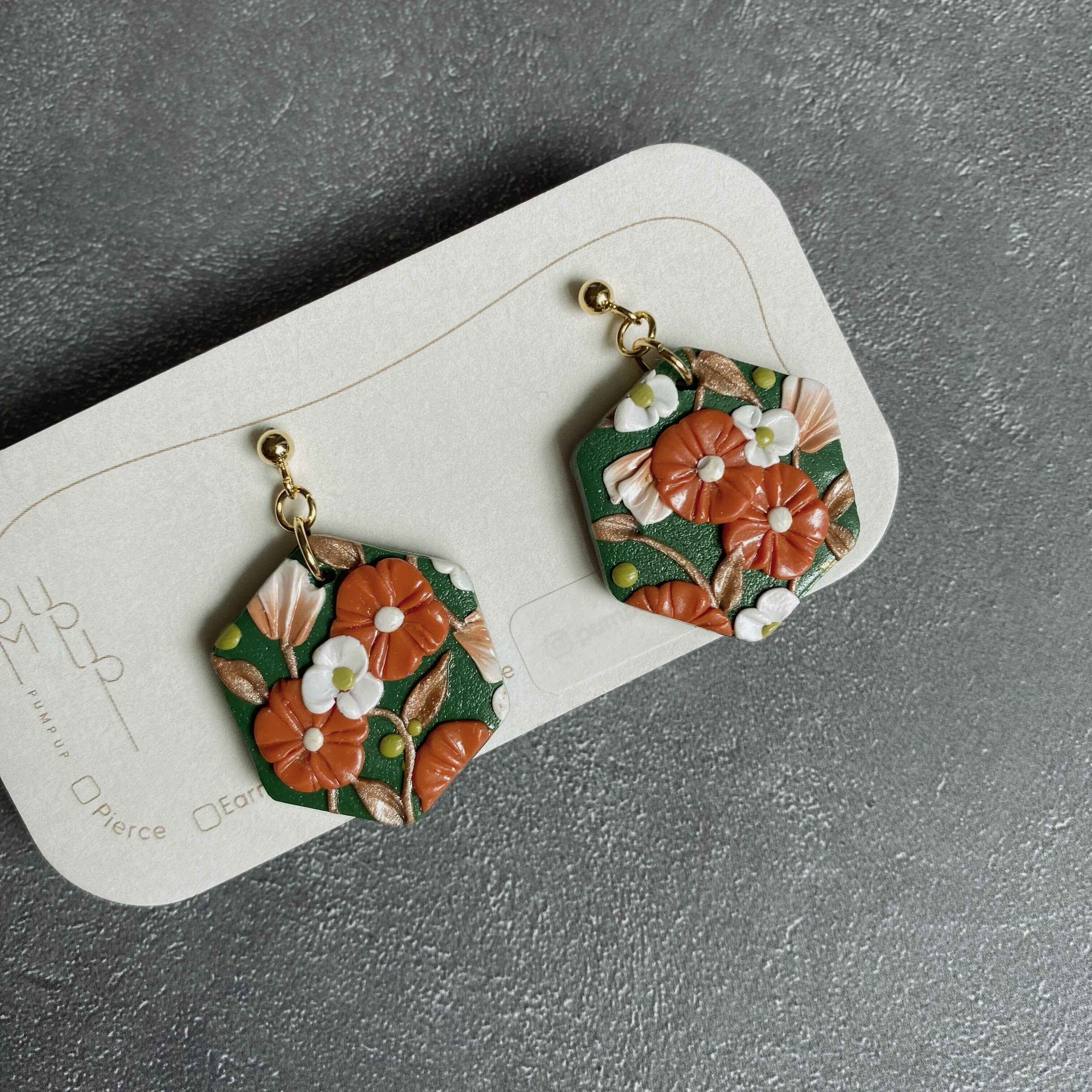 BAKE 6角形 ピアス/イヤリング(緑・ゴールド・オレンジ・白