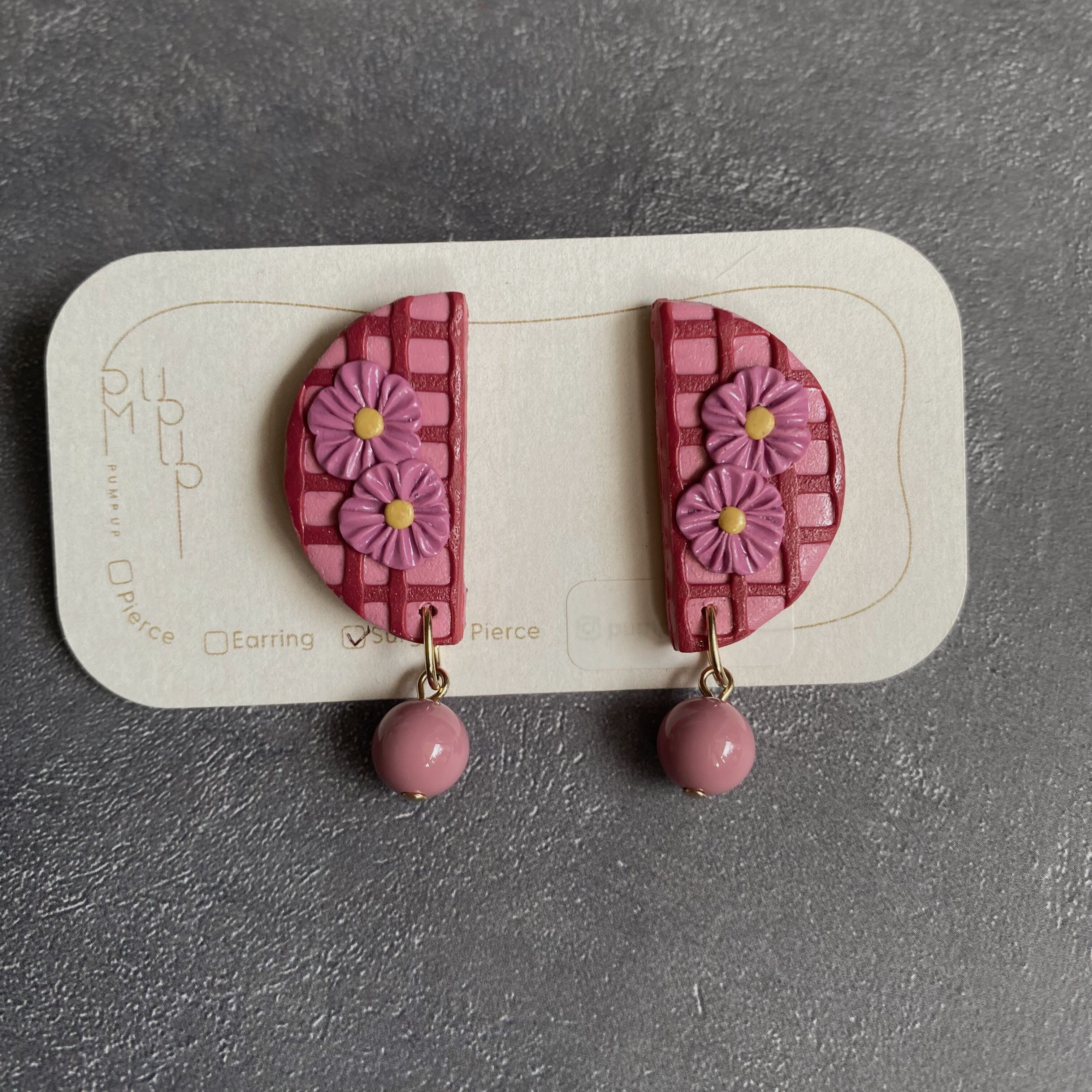 BAKE半円×ビーズ サージカルピアス(チェック ピンク・赤
