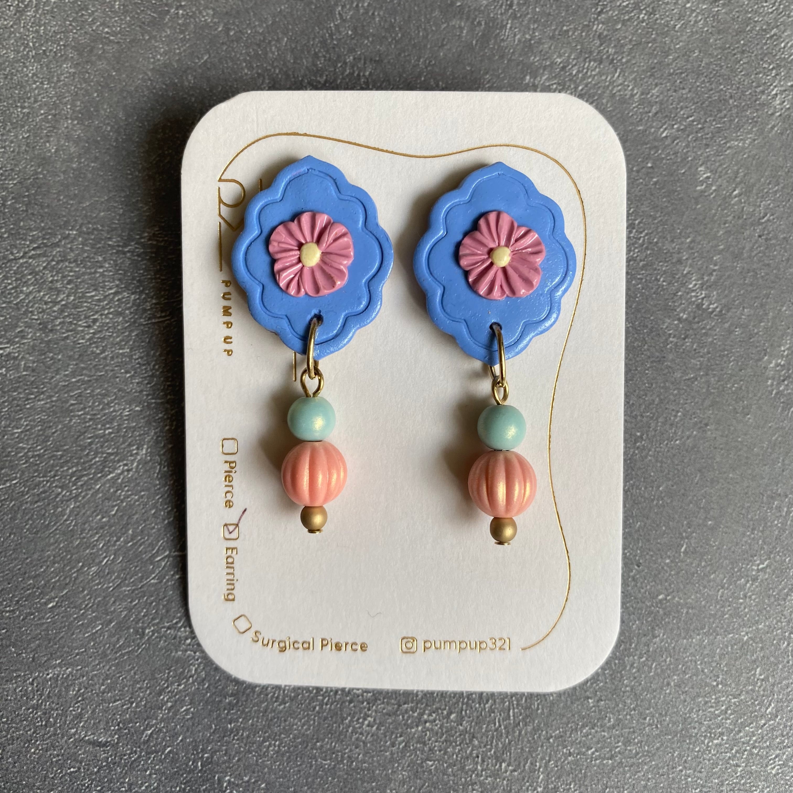 BAKEくねくね菱形×ビーズ イヤリング(ブルー・ピンク・黄色