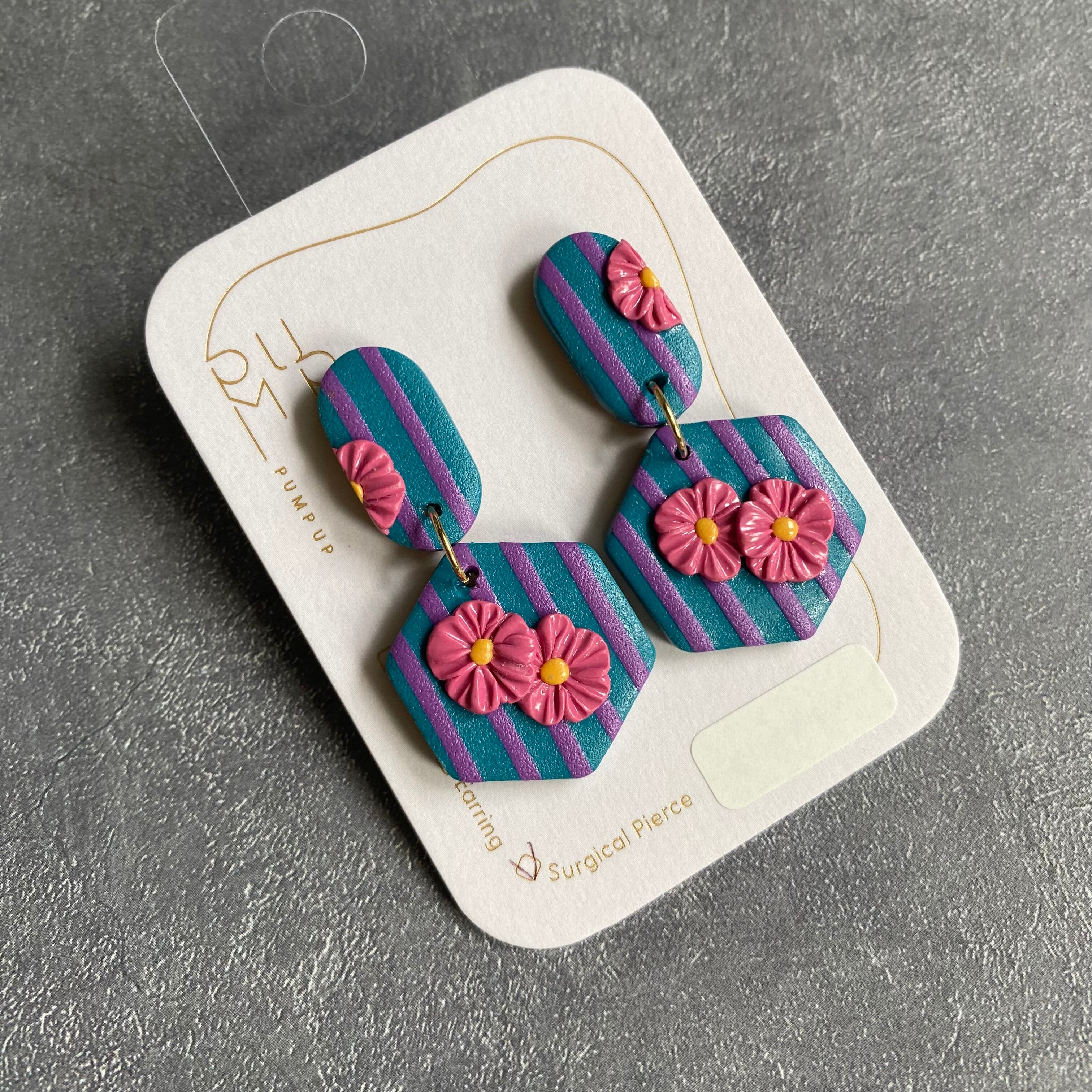 BAKE小楕円×6角形 サージカルピアス(ストライプ ブルー・紫・ピンク