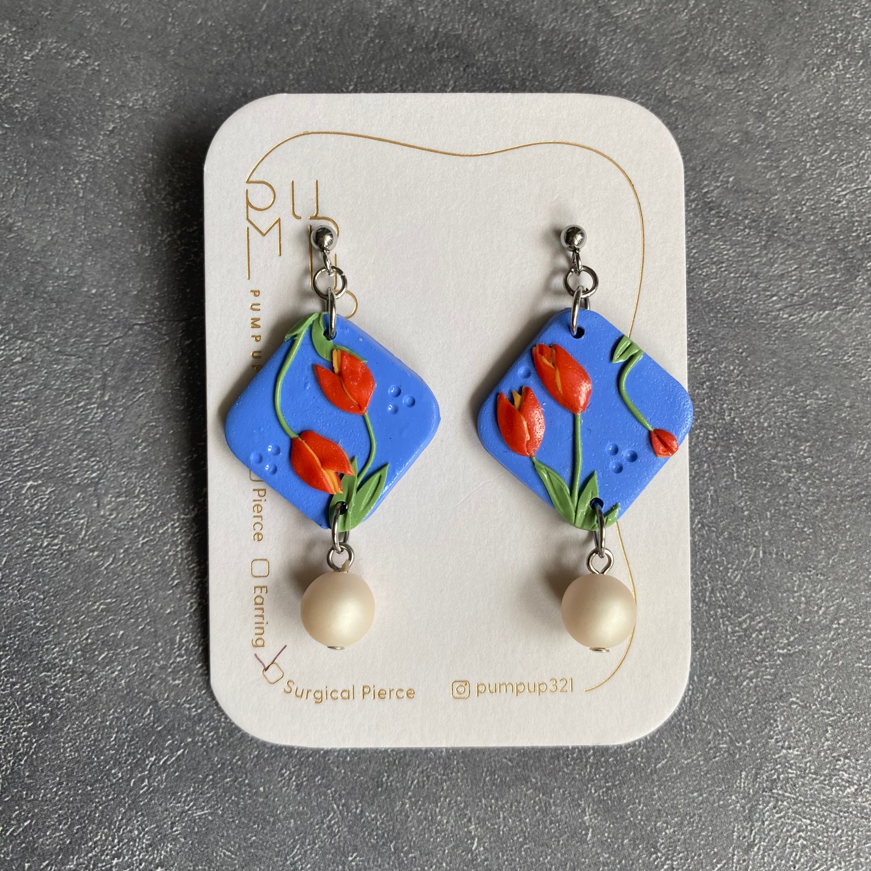 BAKE 角丸正方形×ビーズ ピアス/イヤリング(チューリップ ブルー・緑・赤
