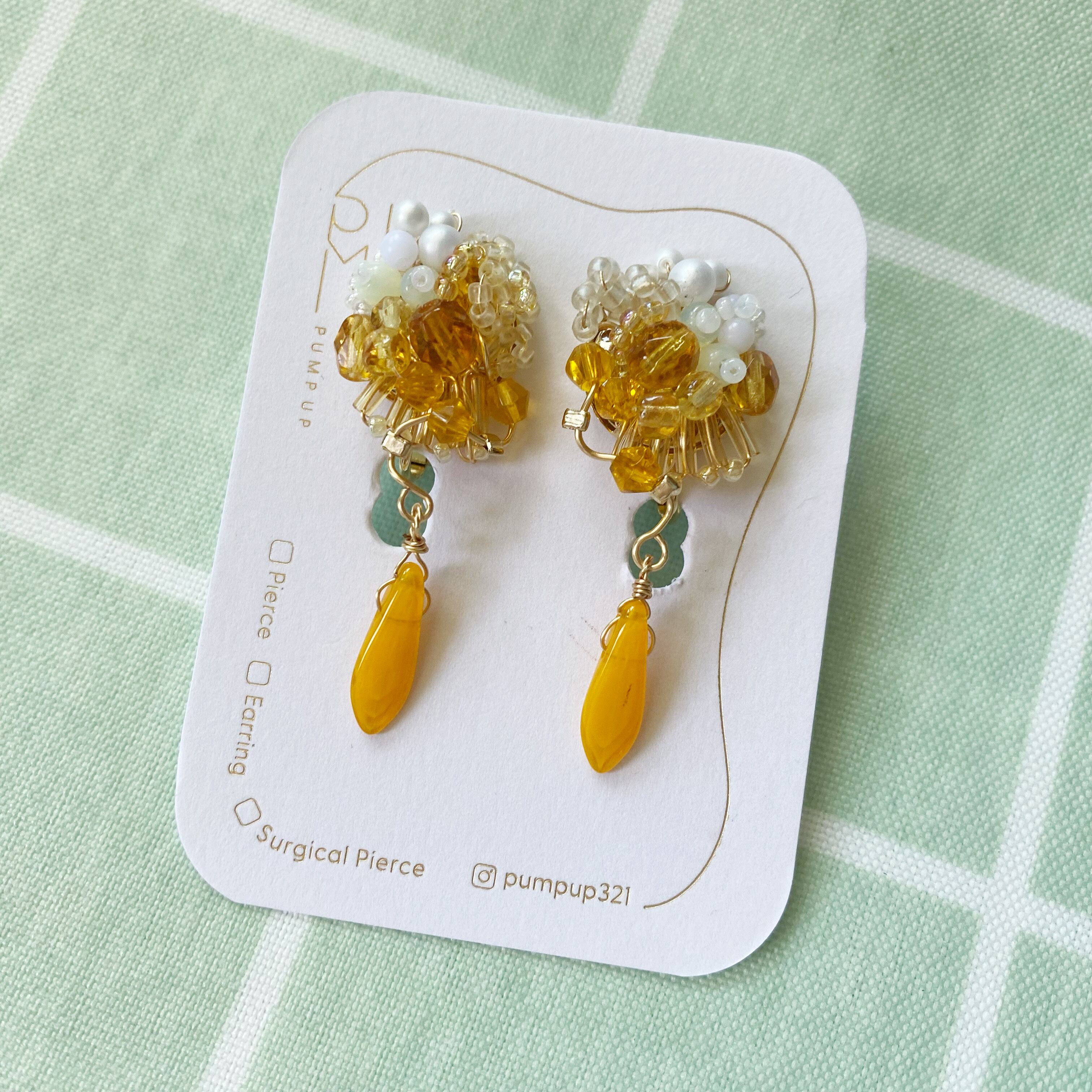 竹ビーズ、チェコビーズ、パールを使用し、透明感のある琥珀色と乳白色の泡を表現しています